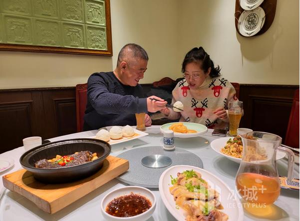 女兒在國外,小年期間,在包房裡享用溫馨大餐的兩口子↑